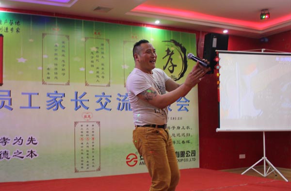 在此次活動中,安邦員工還為家長們帶來精心準備的節目!赌赣H》、《父親的草原、母親的河》、《父親》等大家熟悉的經典老歌,唱出了兒女對父母親表達的感激之情;動感歌舞《精武門》唱嗨了全場,贏得大家陣陣掌聲;一首手語歌《感恩的心》感人肺腑,感恩父母給我們生命、感謝社會給我們以歷練、感謝企業給我們展示的平臺。來自東北的二人轉演員楊杰模仿能力超強,趙本山、單田芳、劉能、趙四模仿的真是惟妙惟肖,贏的笑聲一片、掌聲不斷。