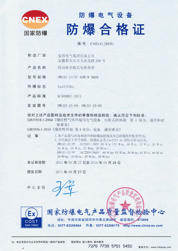 并聯恒功率電伴熱帶的防爆合格證: